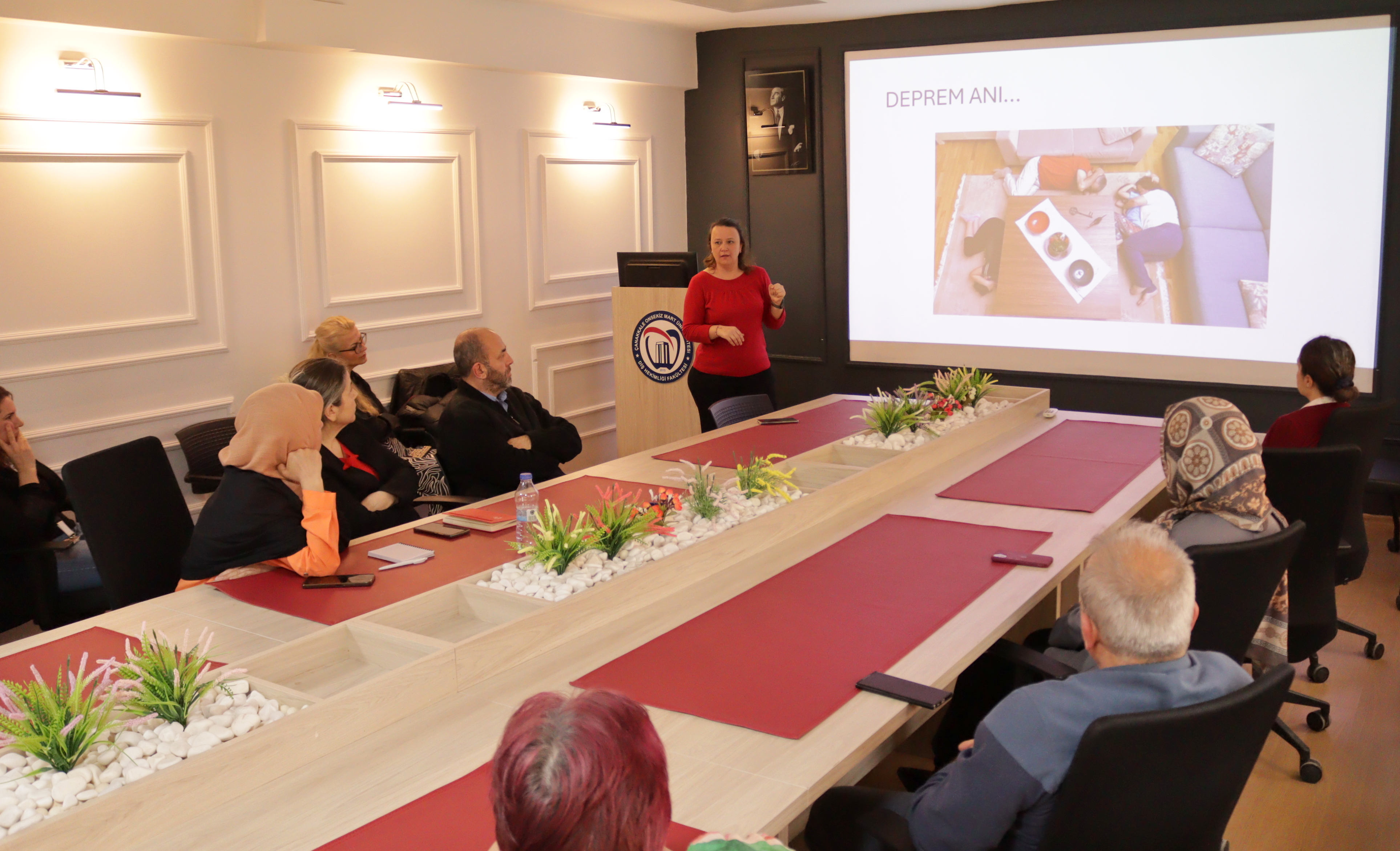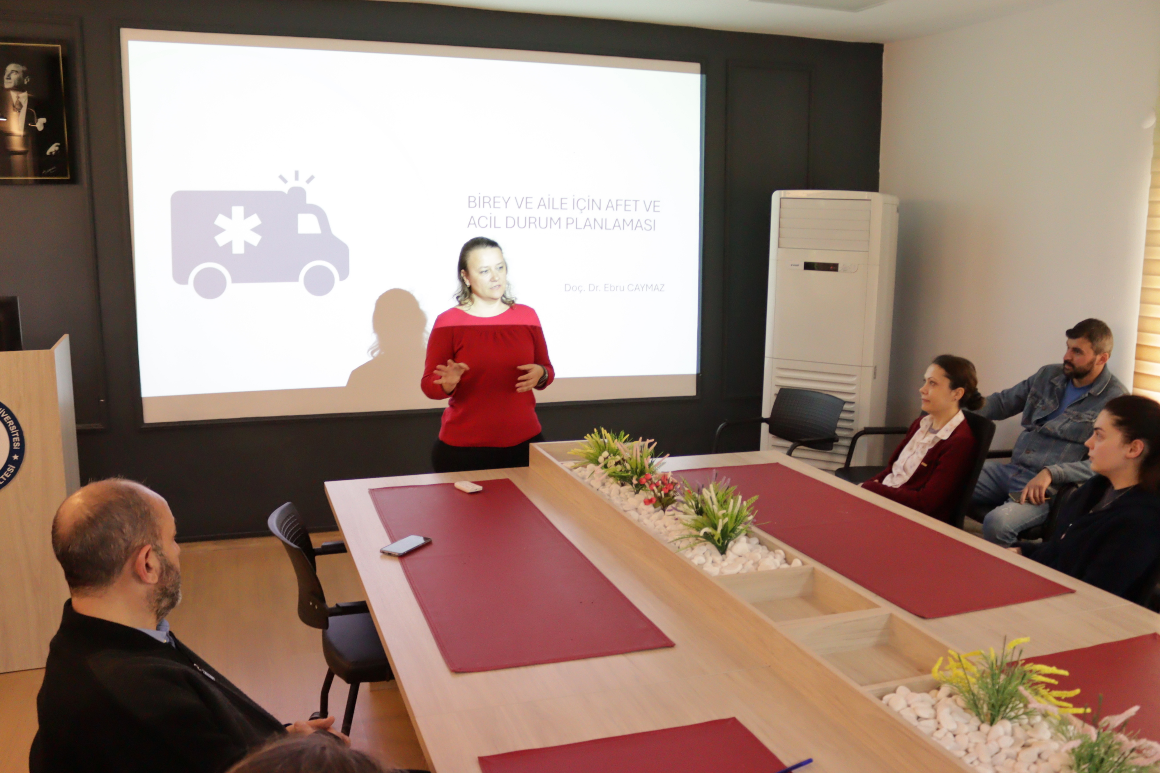 ÇOMÜ Sağlık Bilimleri Fakültesi Acil Yardım ve Afet Yönetimi Bölümü Öğretim Üyesi Doç. Dr. Ebru Caymaz “Birey ve Aile İçin Afet ve Acil Durum Planlaması” başlıklı sunumunda deprem esnasında evde ve iş yerlerinde tehlike oluşturabilecek unsurların tespit edilmesi ve giderilmesi konusunda bilgiler vererek mekanların en kısa sürede nasıl tahliye edileceğini, en yakın yangın tüpünün, en yakın sığınağın nerede olduğu bilmenin ve alınan küçük önlemlerin hayat kurtarabileceğini ifade etti.