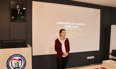 ÇOMÜ Tıp Fakültesi Acil Tıp Anabilim Dalı Öğretim Üyesi Doç. Dr. Canan Akman “Afetlerde Acil Sağlık Hizmetleri” başlıklı sunumunda, Hastane Afet ve Acil Durum Planı (HAP) aktivasyonu kapsamında yapılması gerekenler, olası deprem sonrası hastaların kayıt altına alınmasının önemi, triaj sorumlusunun nitelikleri, triaj alanının özellikleri, renkli kod sistemi, deprem sonrası acil serviste hasta bakımında püf noktaları, olası yaralanma çeşitleri ve tedavi yöntemleri gibi konularda bilgiler verdi.