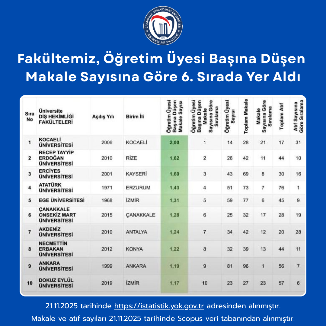 Türkiye’deki devlet üniversitelerinin diş hekimliği fakülteleri ilgili olarak hazırlanan 2025 yılı öğretim üyesi başına düşen makale sayısı sıralamasına göre ÇOMÜ Diş Hekimliği Fakültesi 6. sırada yer aldı.