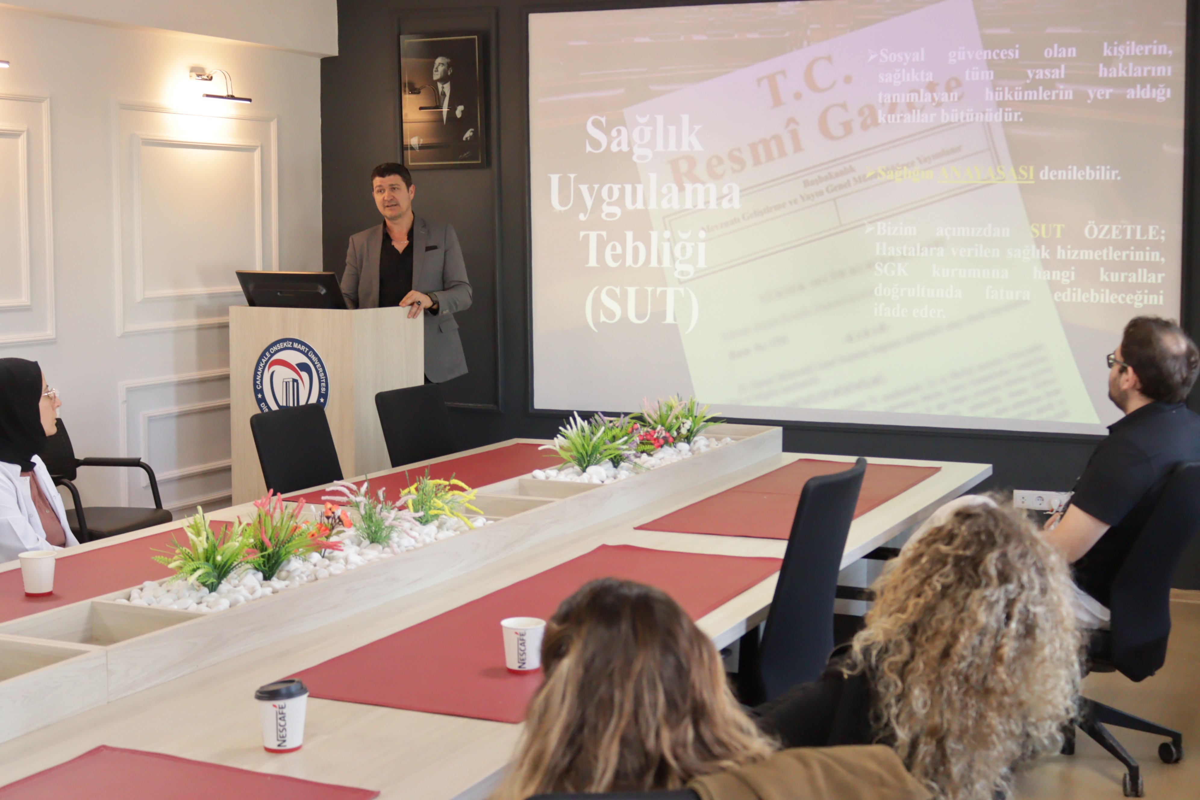 Eğitimde; Fatura Biriminin tanıtımı, Sağlık Uygulama Tebliği (SUT), Sosyal Güvenlik Kurumu (SGK) Medula Sistemi, faturalandırma kuralları, tedavi fiyatlandırmaları, katılım payları, vezne ücret iadeleri konularında bilgiler aktartıldı.