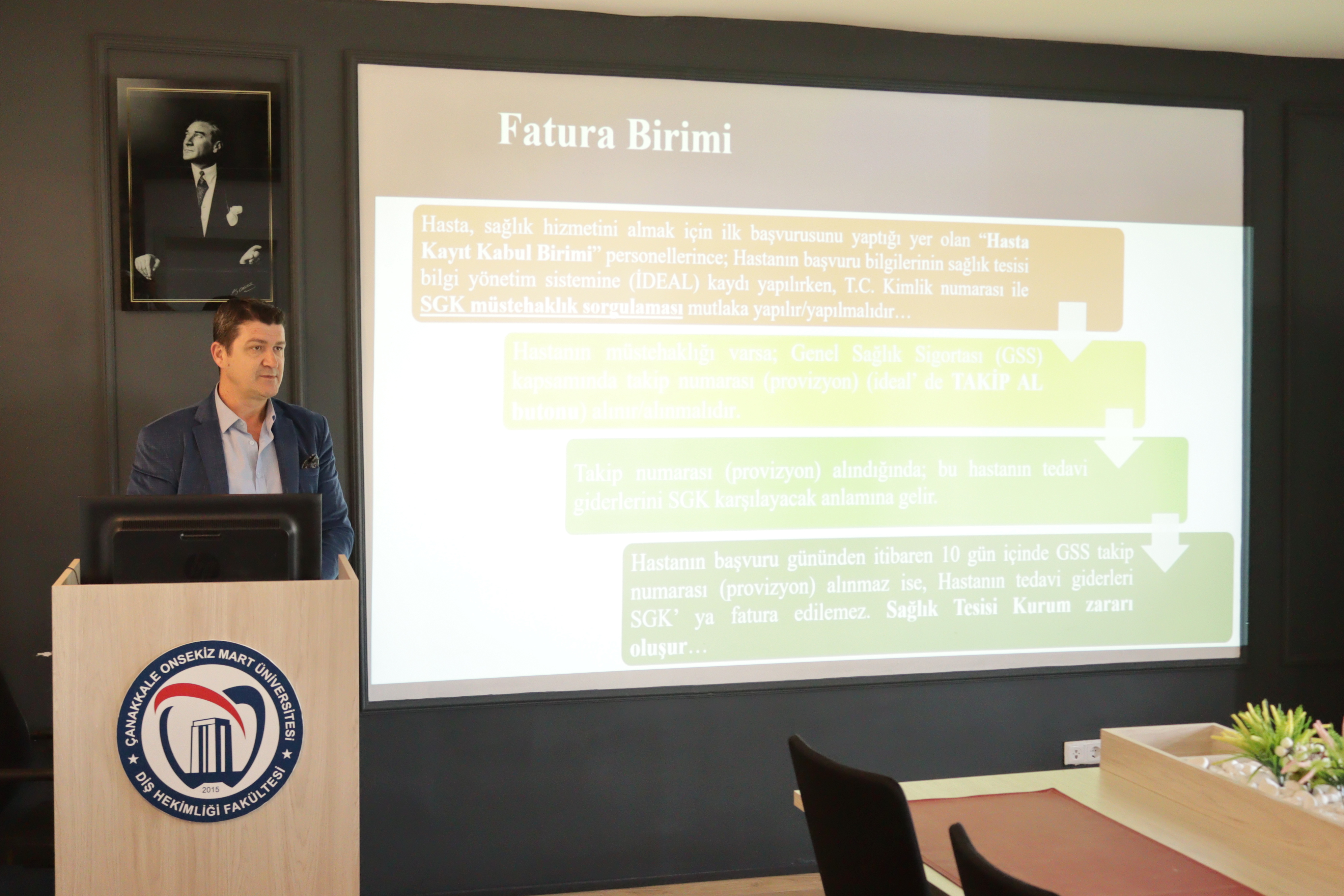 Ağız ve Diş Sağlığı Uygulama ve Araştırma Merkezi (ADSUAM) Fatura Birimi personelleri Sağlık Teknikeri Rahmi Balcı ve Bilgisayar İşletmeni Necip Tugay Çekmece tarafından hazırlanan sunum eşliğinde tüm personele yönelik “Faturalandırma” eğitimi verildi.