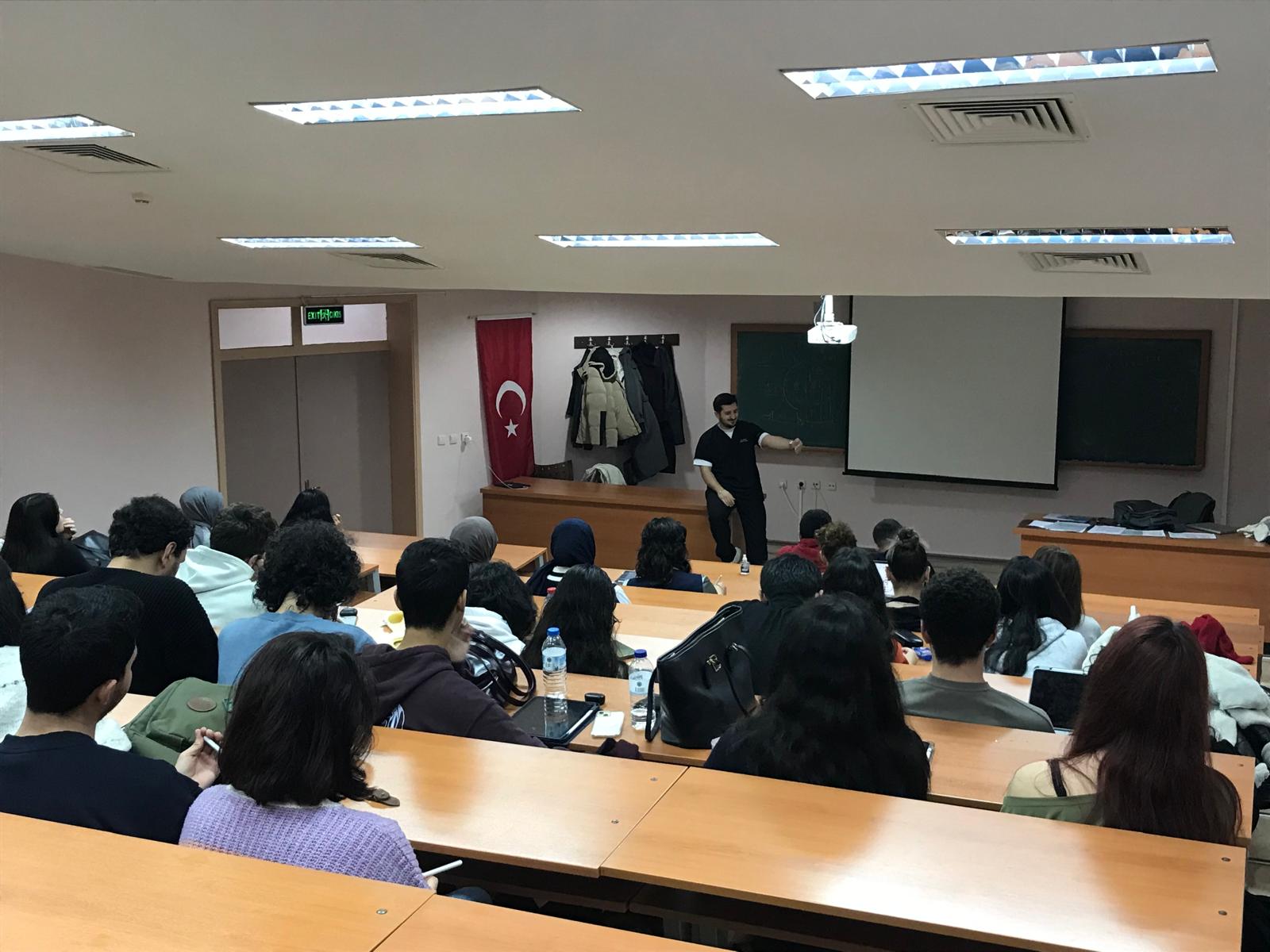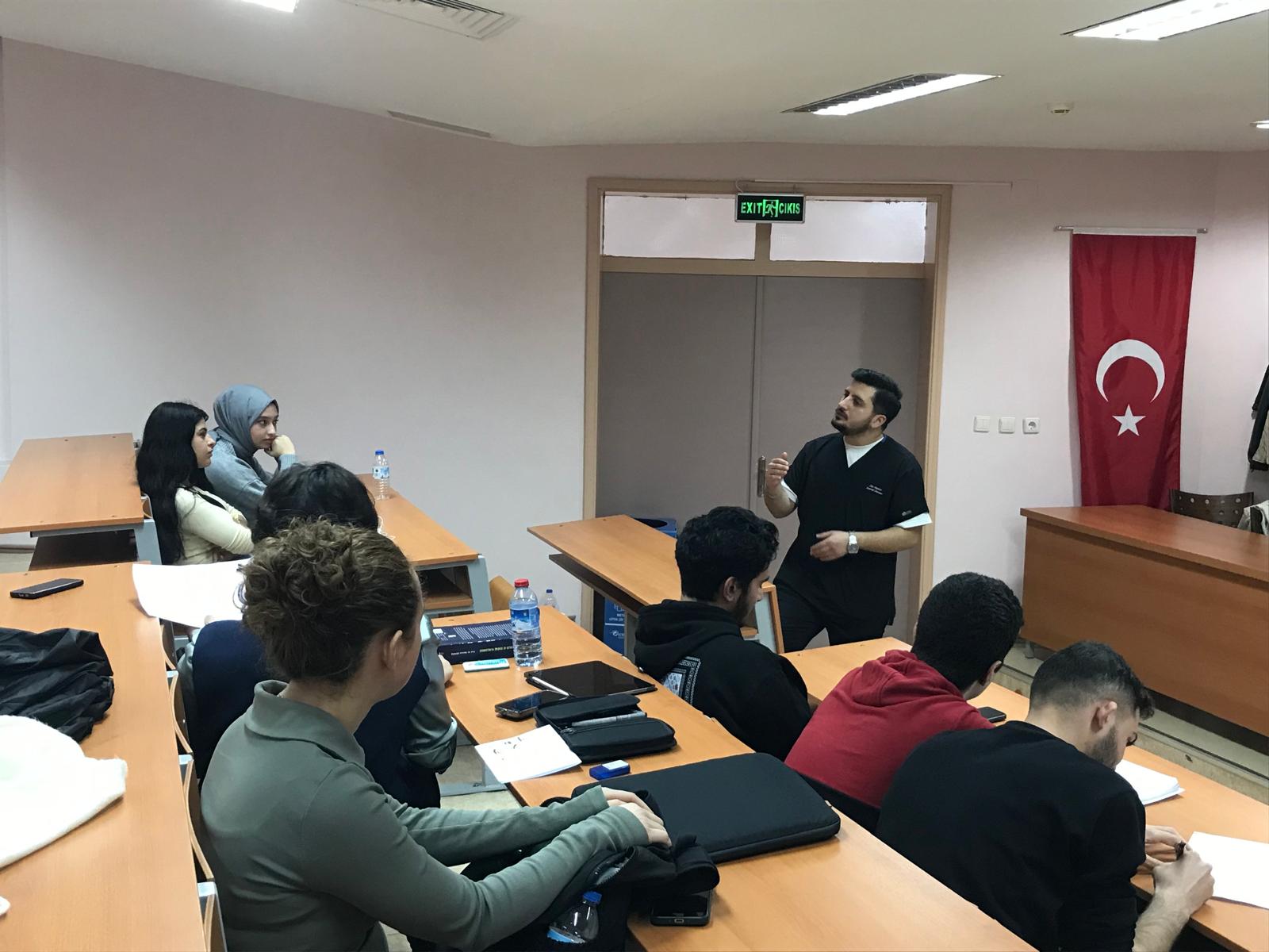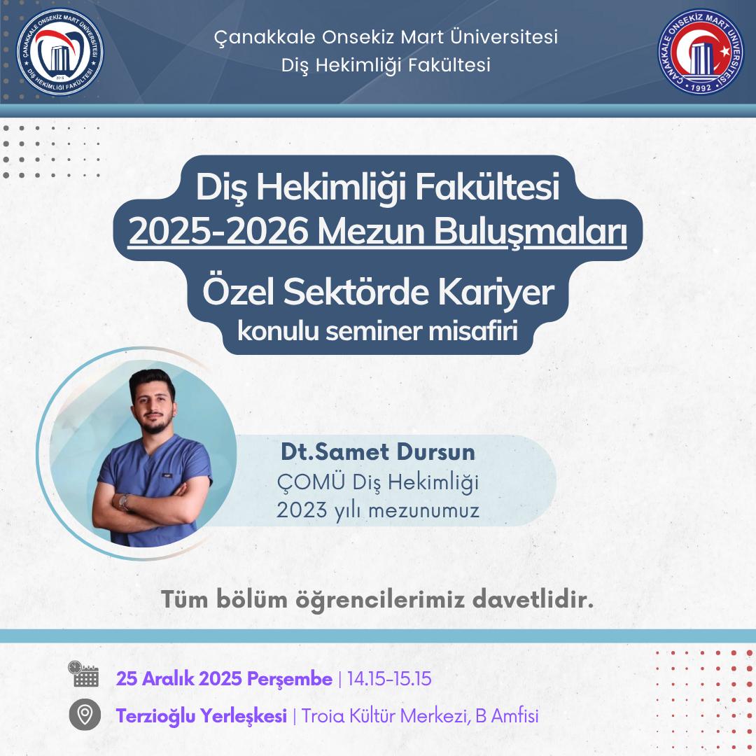 Diş Hekimliği Fakültemiz 2023 yılı mezunu *Dt.Samet DURSUN *, 25 Aralık Perşembe günü Diş Hekimliği Fakültemizde 1.sınıf öğrencilerimizle “Özel Sektörde Kariyer” konulu söyleşide buluştu.