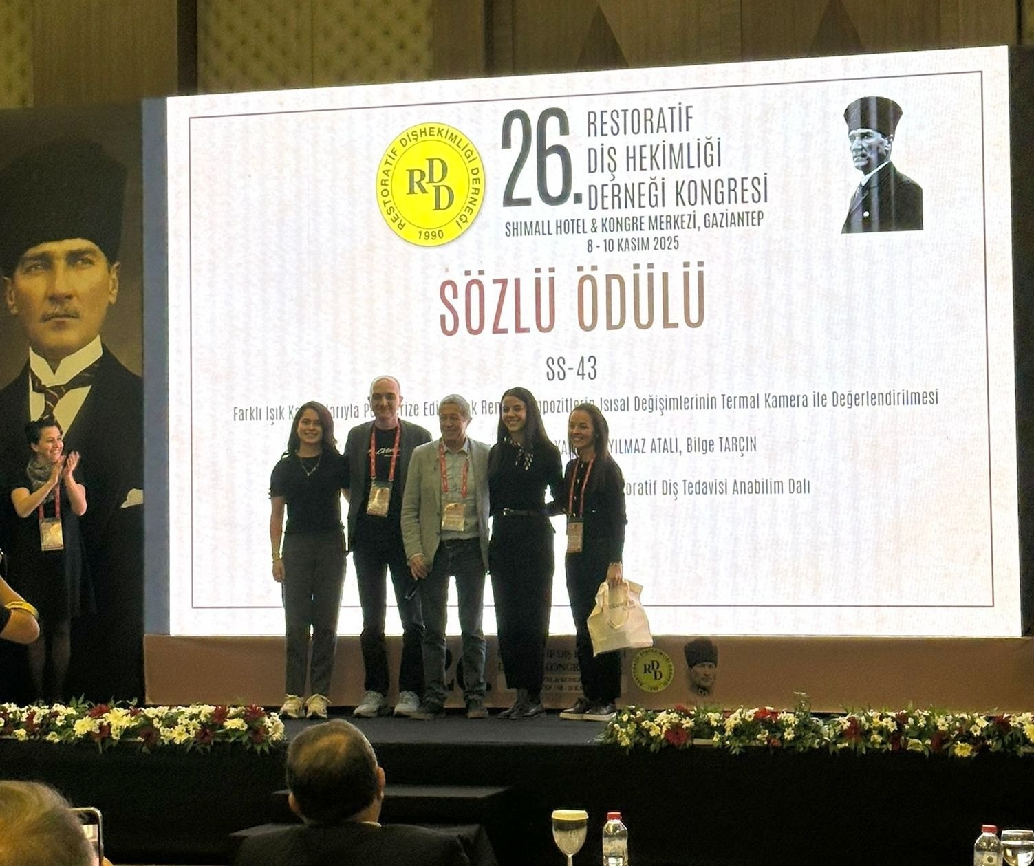 Fakültemiz Restoratif Diş Tedavisi Anabilim Dalı Öğretim Üyesi Dr. Öğr. Üyesi Bengü Doğu Kaya’nın araştırma ekibinde yer aldığı, Marmara Üniversitesi Diş Hekimliği Fakültesi Restoratif Diş Tedavisi Anabilim Dalı ile ortak yürütülen çalışma, Gaziantep’te düzenlenen 26. Restoratif Diş Hekimliği Derneği Kongresi’nde “10 Kasım Jüri Özel Sözlü Sunum Ödülü”ne layık görüldü.
