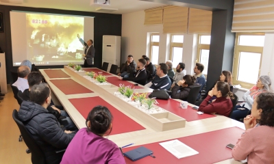 İbn-i Sina Konferans Salonunda, tüm personele yönelik düzenlenen eğitimde; itfaiyenin görevleri, yangının sınıflandırılması, kurumlarda yangın güvenlik önlemleri, tahliye organizasyonu, söndürme maddeleri konularında ilgili videolar eşliğinde bilgiler verildi.